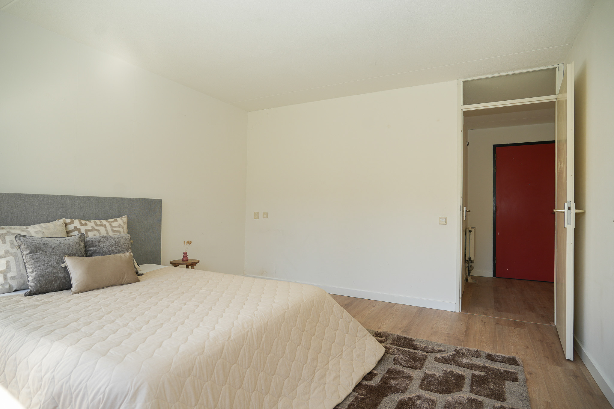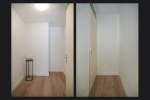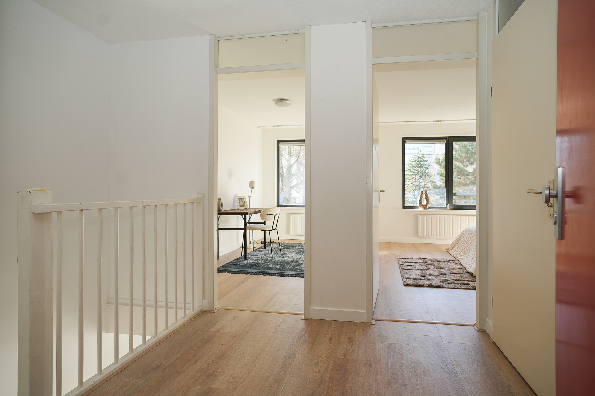 Entree met hal die toegang geeft tot twee slaapkamers en de badkamer.