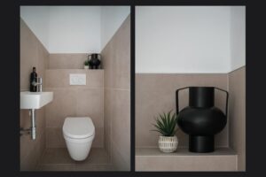 Via een portaal is het separate toilet (2026) bereikbaar, uitgevoerd in dezelfde moderne stijl als de badkamer en voorzien van een fontein.