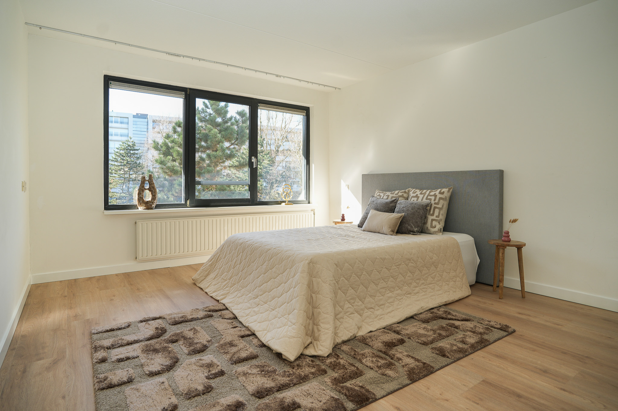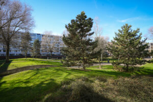 De slaapkamers van circa 15 m² en 9 m² kijken beide uit op de groene binnentuin, wat zorgt voor een rustige en prettige sfeer.