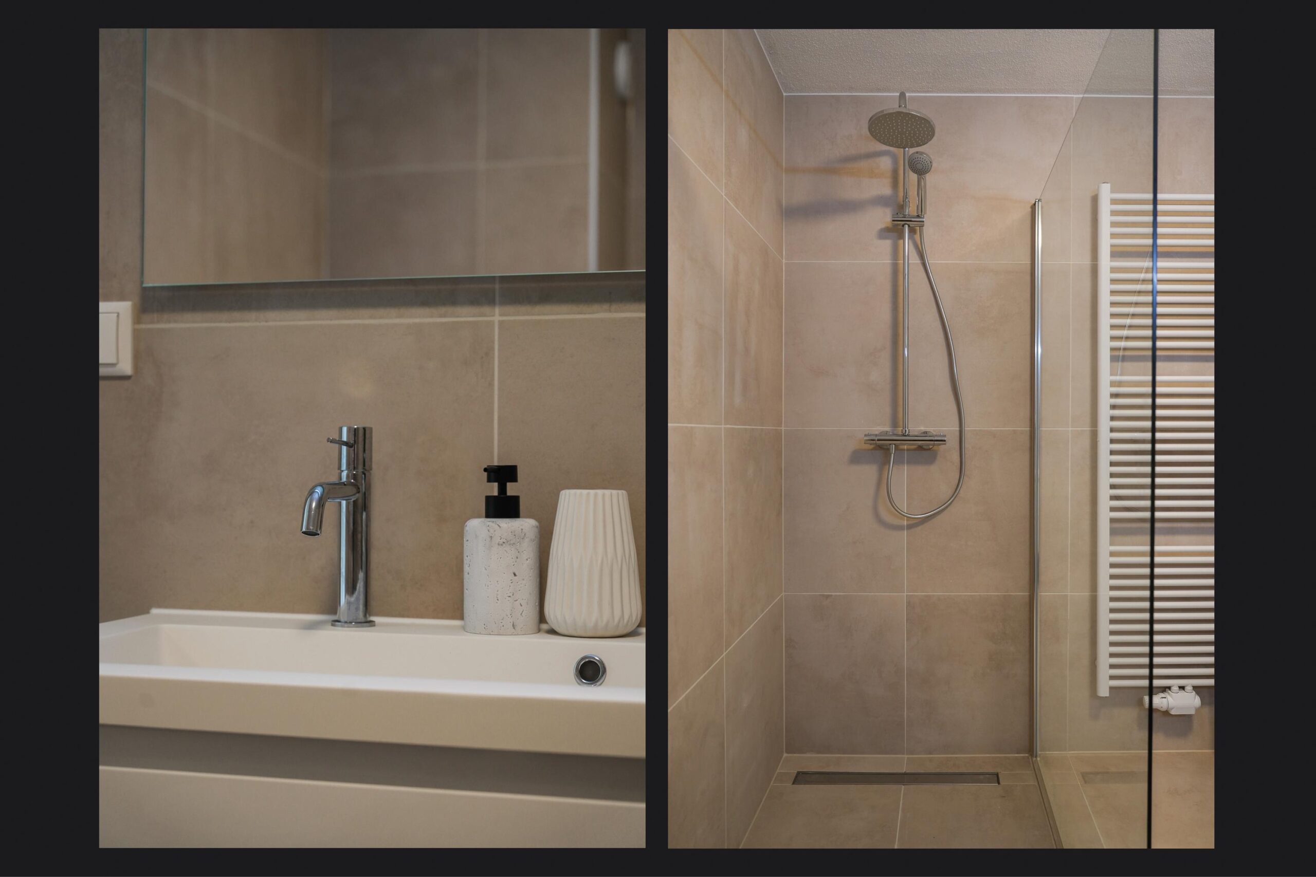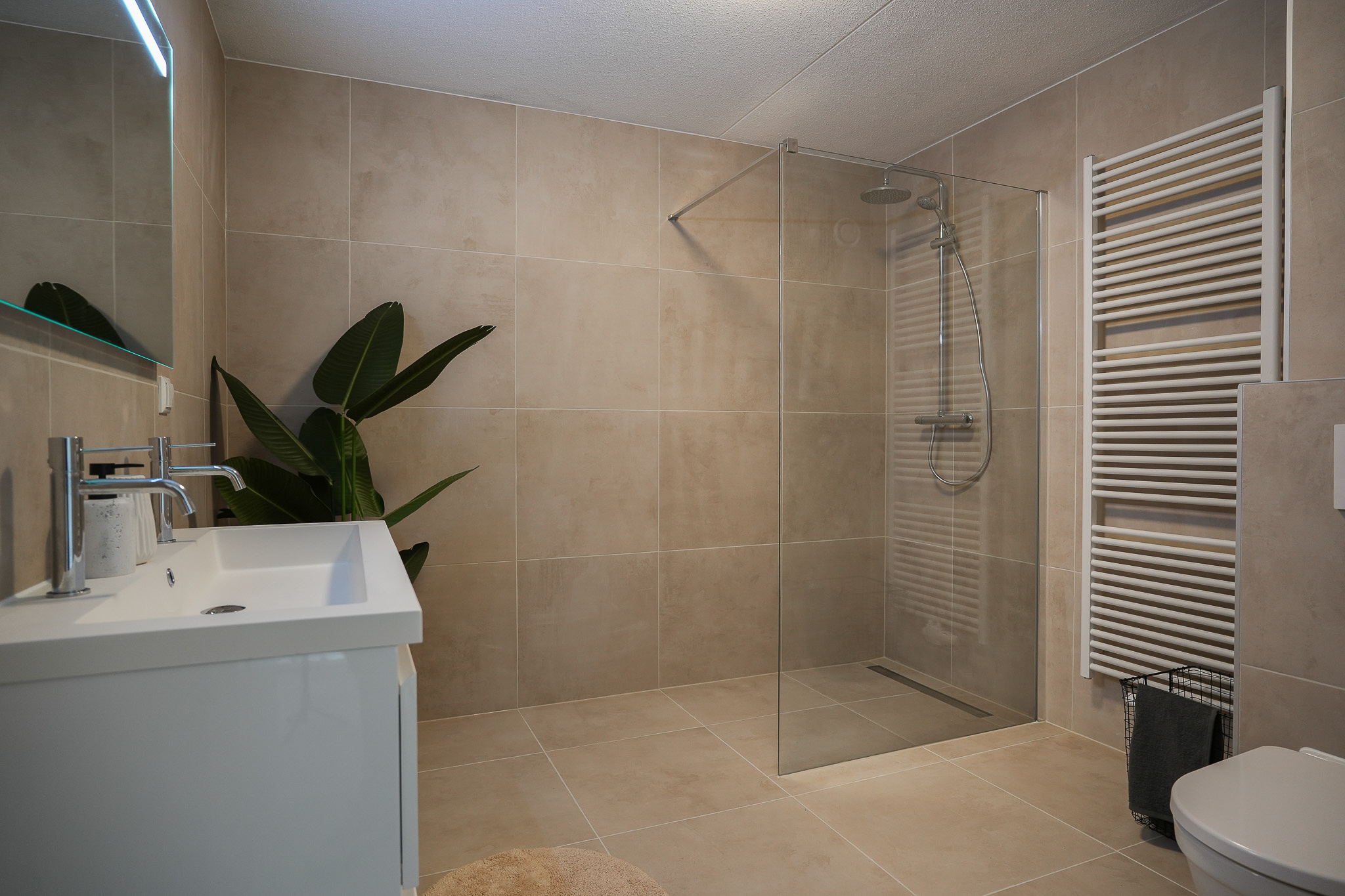 De badkamer (vernieuwd in 2026) is modern en stijlvol afgewerkt met beige vloer- en wandtegels. De ruimte is voorzien van een ruime inloopdouche, een dubbele wastafel met meubel, een spiegel met verlichting, een hangend toilet en een designradiator.