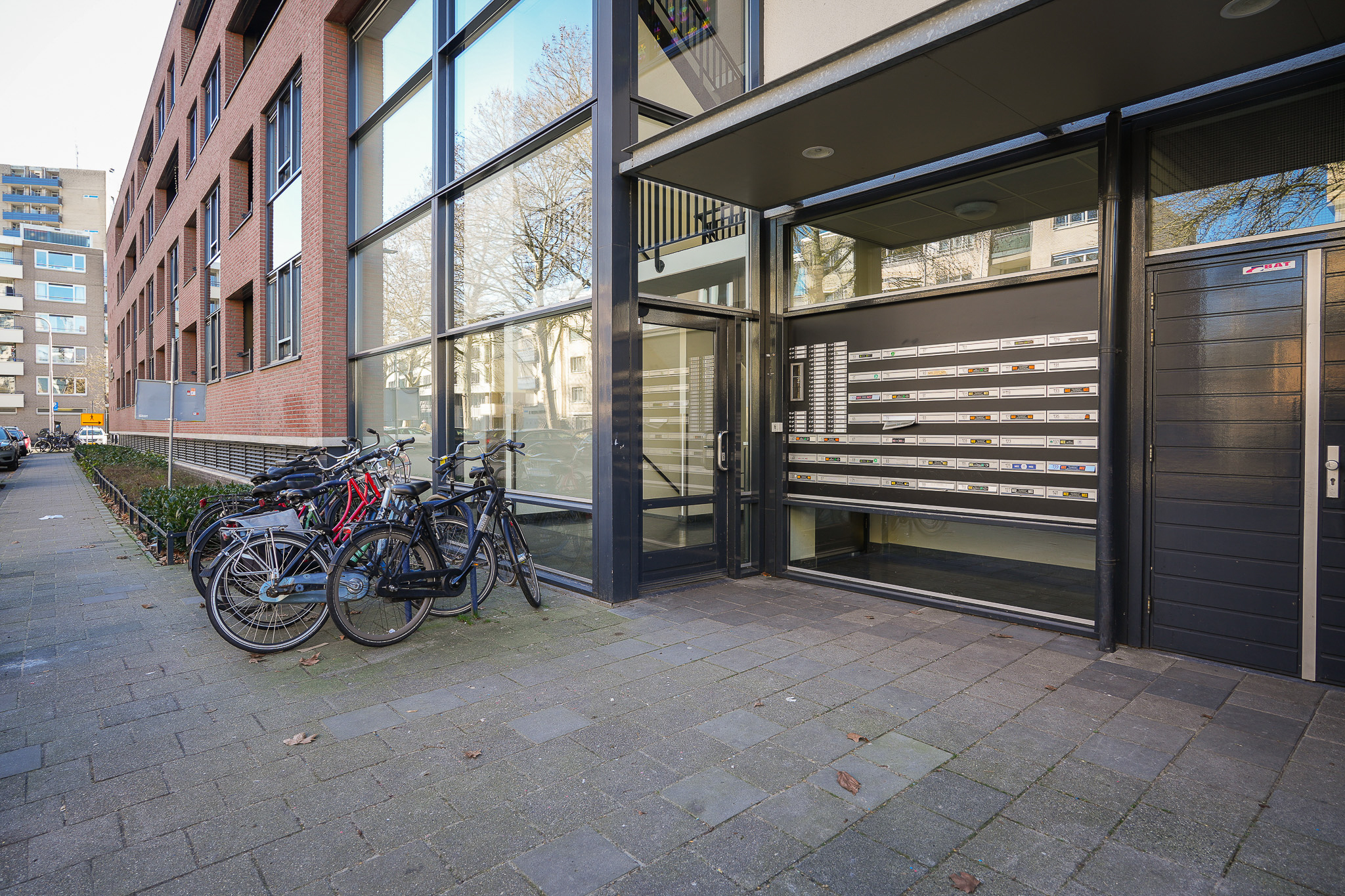 Centrale entree, keurige hal met videofooninstallatie, brievenbussen, liftinstallatie en het trappenhuis.