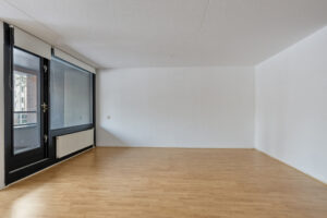 Sfeervolle en ruime woonkamer circa 46 m² (inclusief keuken) met vele raampartijen en het balkon gelegen op het oosten.