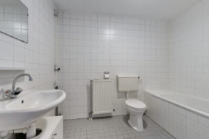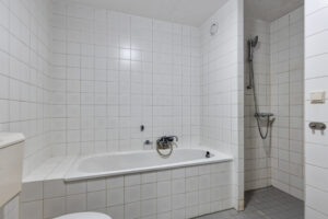 Licht betegelde badkamer voorzien van een vaste wastafel, ligbad, aparte douche en toilet. Tevens zijn hier de aansluiting voor wasmachine en droger.