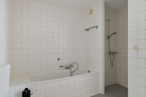 Licht betegelde badkamer voorzien van een vaste wastafel, ligbad, aparte douche en toilet. Tevens zijn hier de aansluiting voor wasmachine en droger.