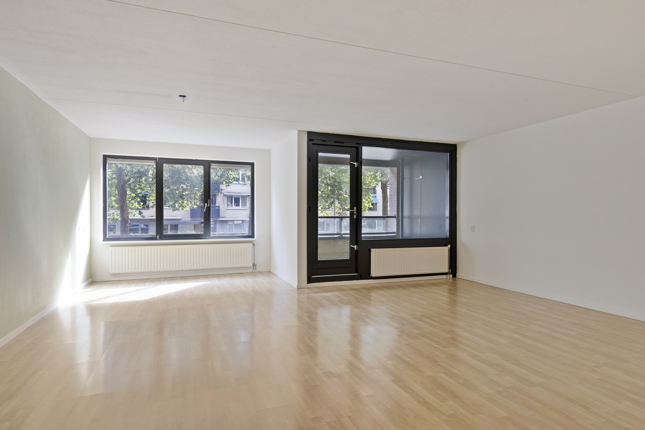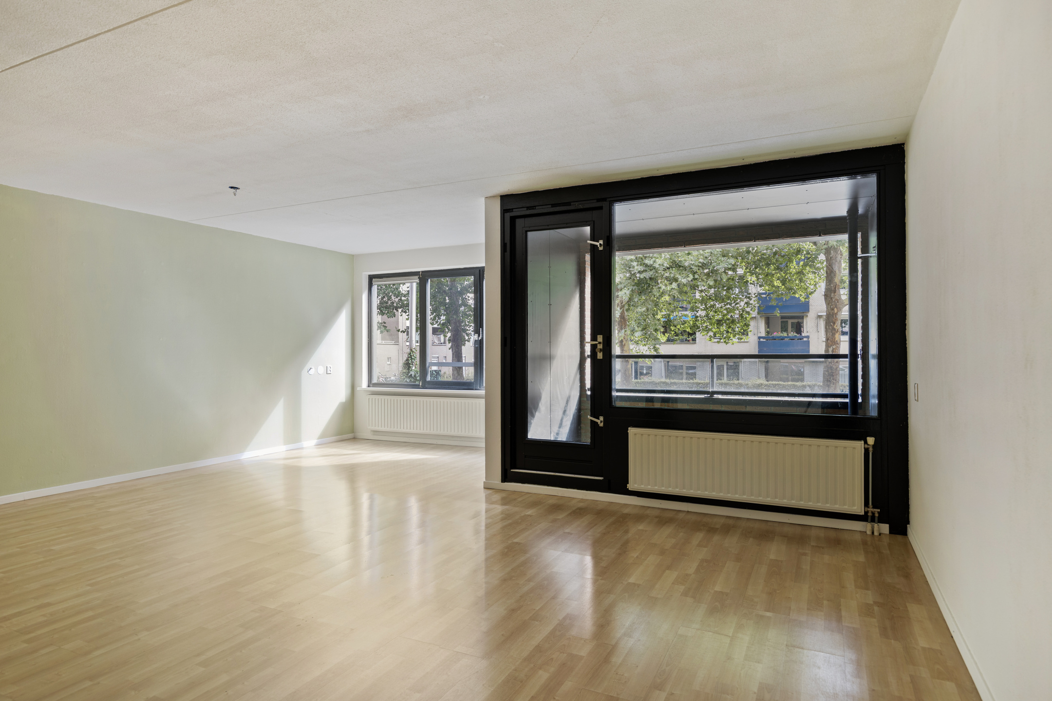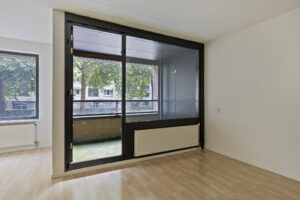 Sfeervolle en ruime woonkamer circa 47 m² (inclusief keuken) met vele raampartijen en het balkon gelegen op het oosten.
