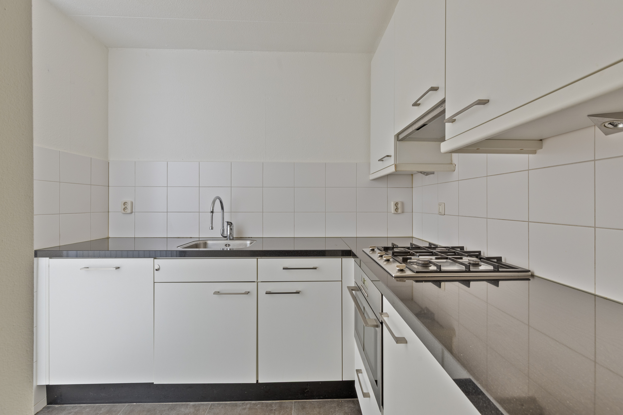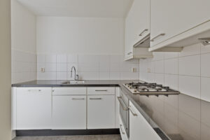 Half open keuken. De keukeninrichting is voorzien van een 4 pits gasfornuis, afzuigkap, koelkast, combi magnetron en vaatwasser.