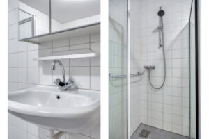 De badkamer is praktisch ingericht, met een wastafel, spiegel, douchecabine en aansluiting voor de wasapparatuur.