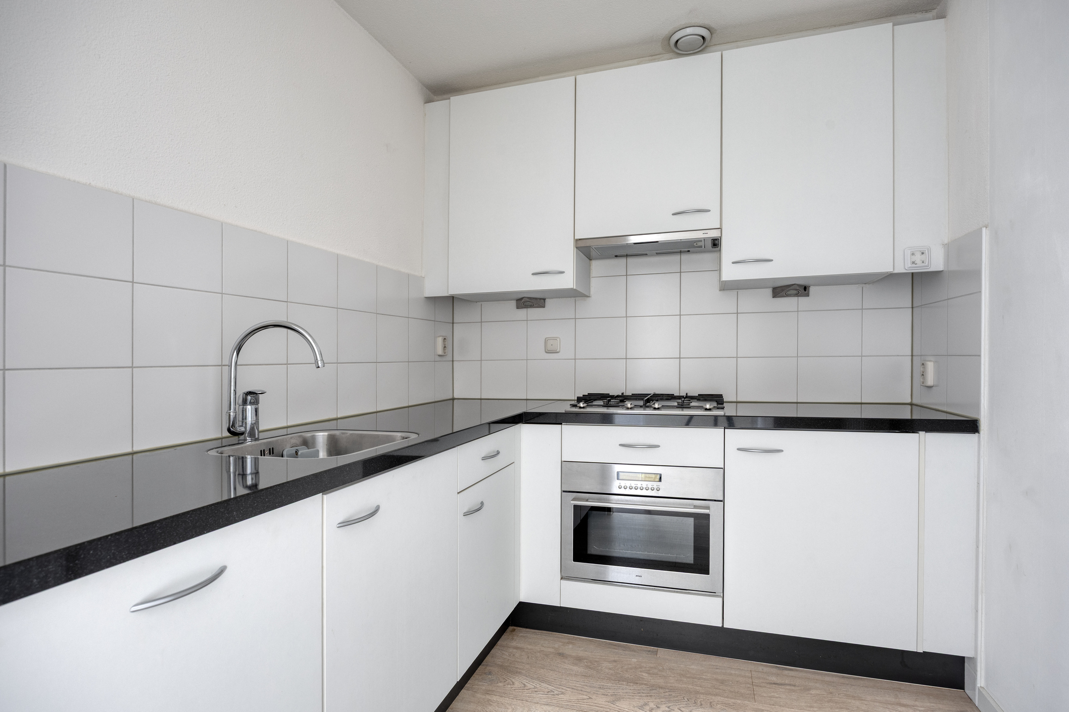 De keuken is semi-open en heeft een hoekopstelling. De inrichting is voorzien van een granieten werkblad, 4-pits gaskookplaat, afzuigkap, koelkast, combimagnetron en vaatwasser.