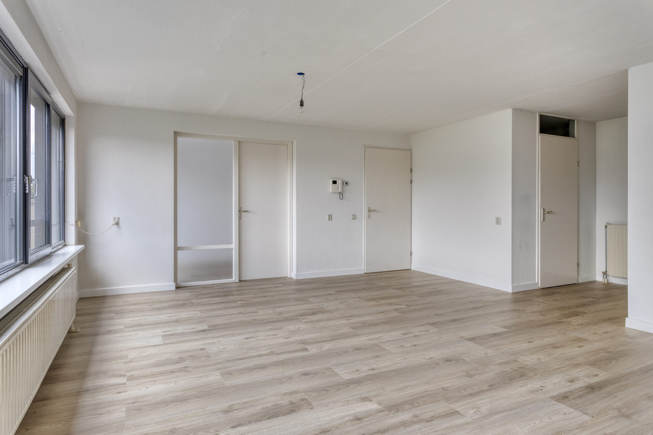 Sfeervolle woonkamer circa 38m² (inclusief keuken) met laminaatvloer en veel raampartijen, die een fraai zicht op de binnentuin bieden.