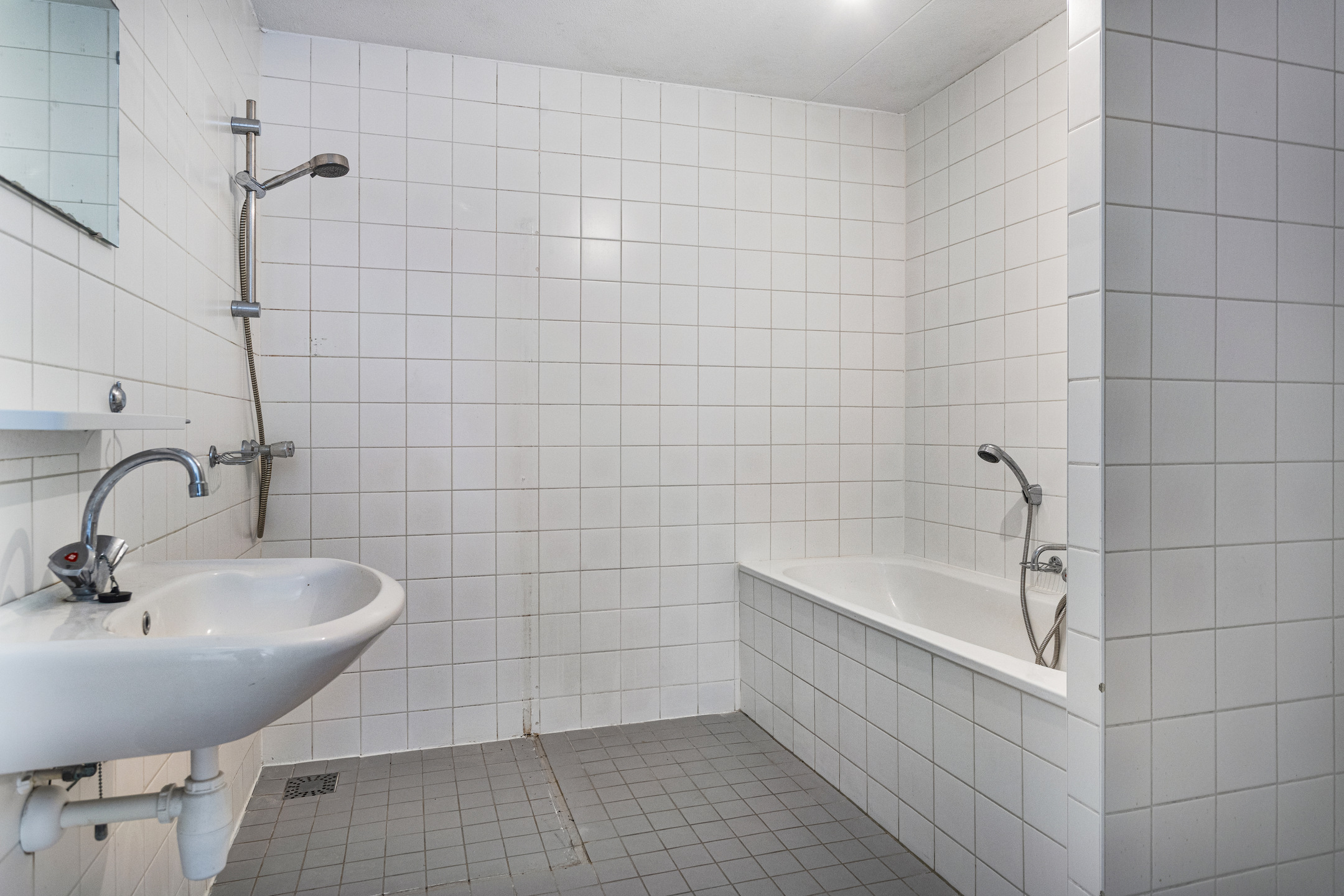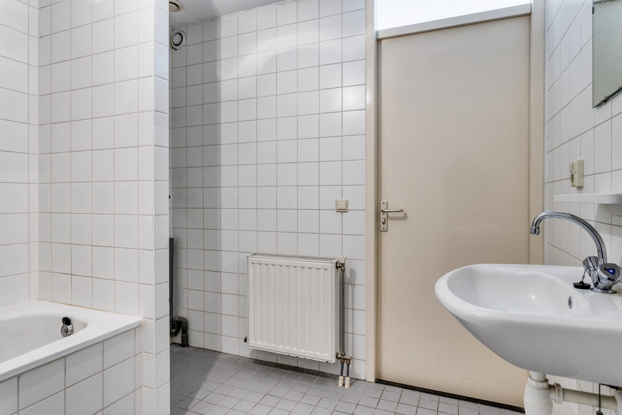 Licht betegelde badkamer voorzien van een vaste wastafel, ligbad en een inloopdouche met thermostaat kraan. In de badkamer bevindt zich tevens de aansluiting voor de wasapparatuur.