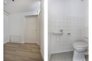 Entree, hal met laminaatvloer en een gedeeltelijk, licht betegeld toilet met fontein.