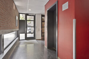 Centrale entree, keurige hal met videofooninstallatie, brievenbussen, liftinstallatie en het trappenhuis.