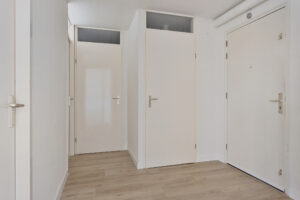 De hal geeft toegang tot de woonkamer, twee slaapkamers en de badkamer.