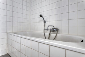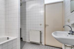 Licht betegelde badkamer voorzien van een vaste wastafel, ligbad en een inloopdouche met thermostaat kraan. In de badkamer bevindt zich tevens de aansluiting voor de wasapparatuur.