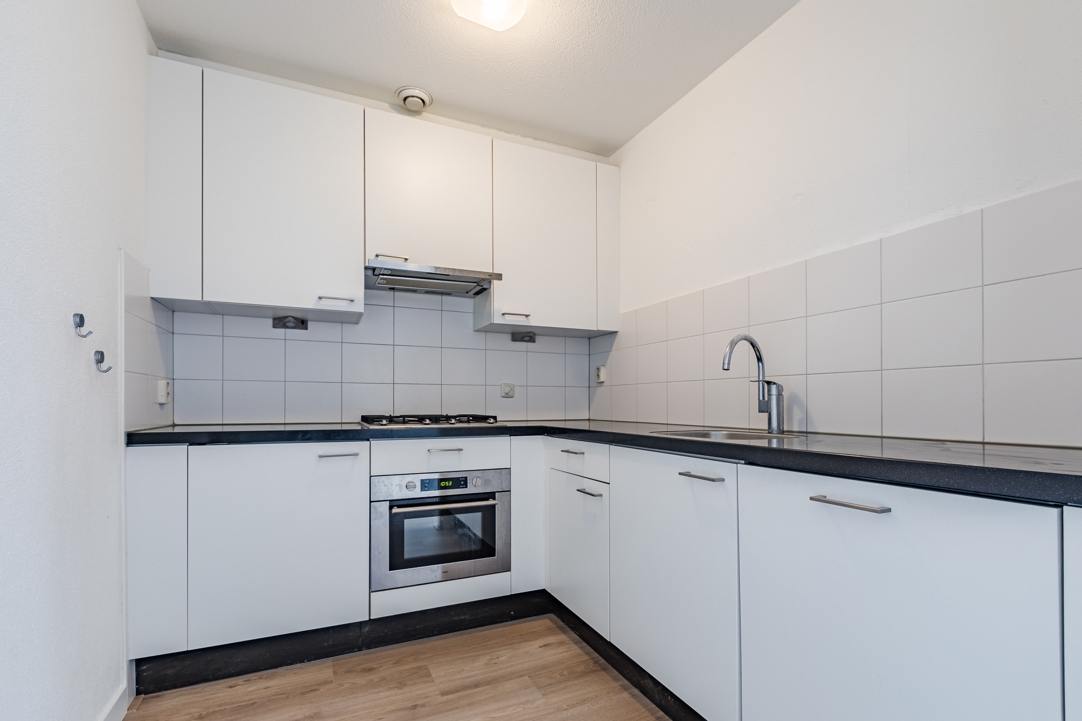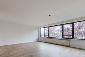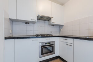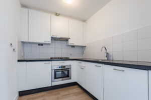 De sfeervolle woonkamer van circa 38 m² (inclusief keuken) vormt het hart van het appartement en is voorzien van een nieuwe vloer (2026). De grote raampartijen op de westzijde zorgen voor een aangename lichtinval en bieden een fraai uitzicht op de groene binnentuin. Door de ruime opzet is er plaats voor zowel een comfortabele zithoek en een eethoek, een heerlijke plek om te ontspannen of gasten te ontvangen. De semi-open keuken sluit mooi aan op de woonkamer en is uitgevoerd in een hoekopstelling. De keukeninrichting is voorzien van een granieten blad, 4-pits gaskookplaat, afzuigkap, koelkast, combi magnetron en een vaatwasser.
