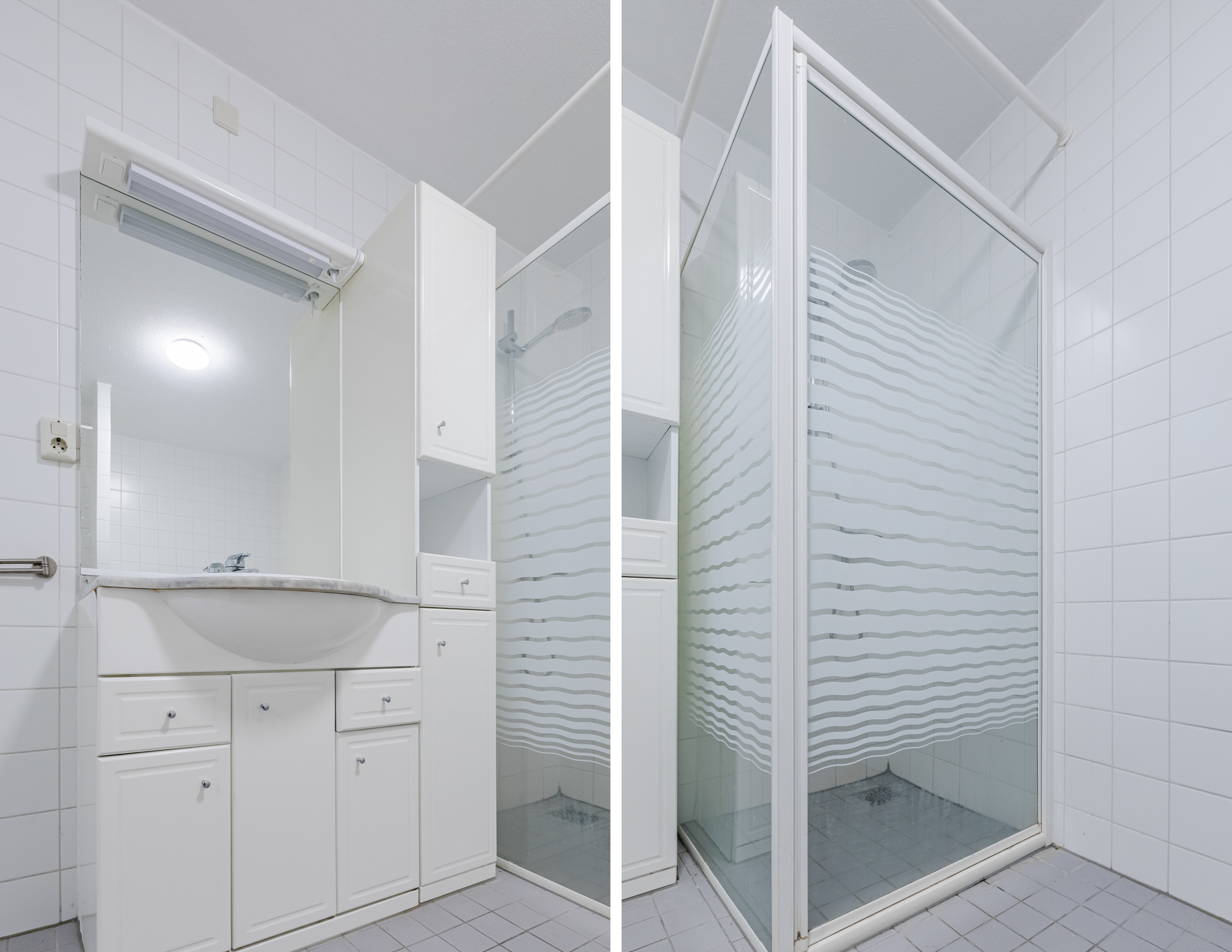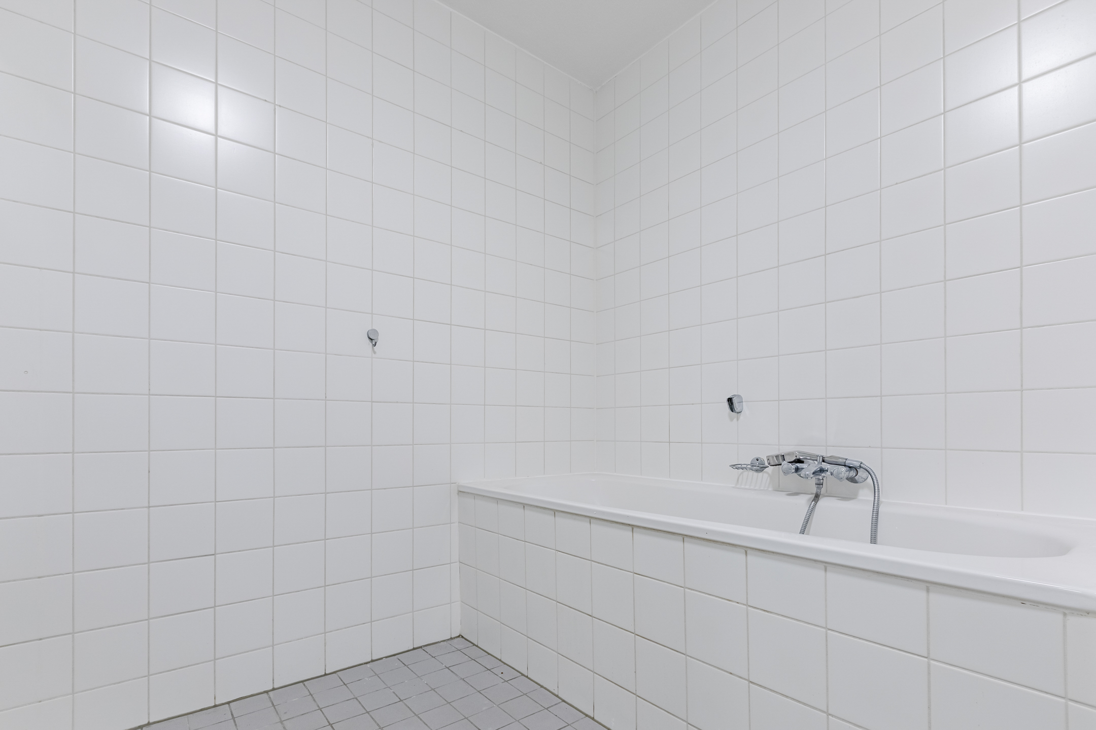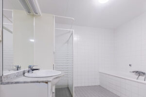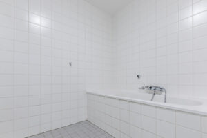 Licht betegelde badkamer voorzien van een vaste wastafel met meubel, ligbad en een inloopdouche met thermostaat kraan. In de badkamer bevindt zich tevens de aansluiting voor de wasapparatuur.
