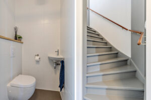 Entree, ruime hal met een fraaie strizo-grindvloer, strak stucwerk wand- en plafondafwerking, meterkast en een moderne toiletruimte voorzien van een vrij hangend toilet met fontein en strak stucwerk plafondafwerking.