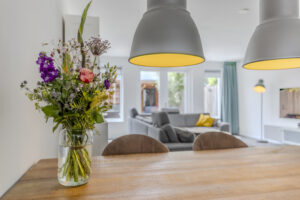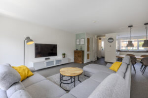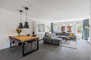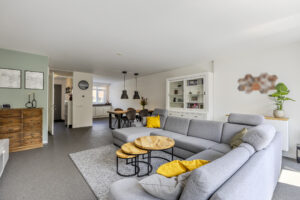 Royale en over de volle breedte uitgebouwde woonkamer circa 49m² (inclusief keuken) met een fraaie strizo-grindvloer voorzien van vloerverwarming, strak stucwerk wand- en plafondafwerking, trapkast, inbouwspots en twee openslaande tuindeuren die toegang geven tot de fraai aangelegde achtertuin.