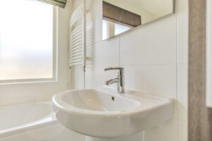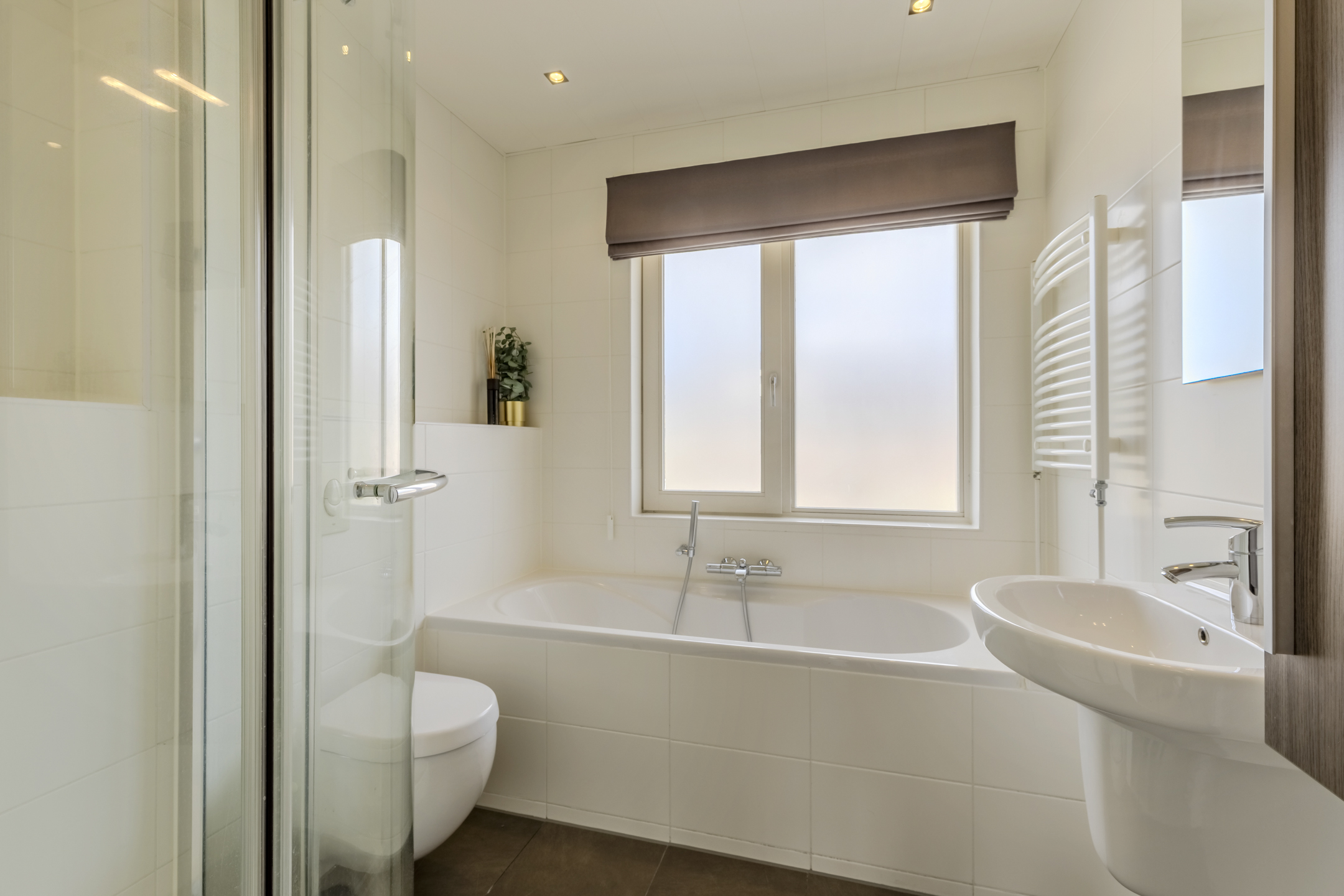Moderne badkamer voorzien van een vaste wastafel met meubel, ligbad met thermostaat kraan, aparte douche met thermostaat kraan en een vrij hangend toilet.