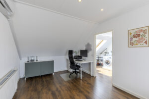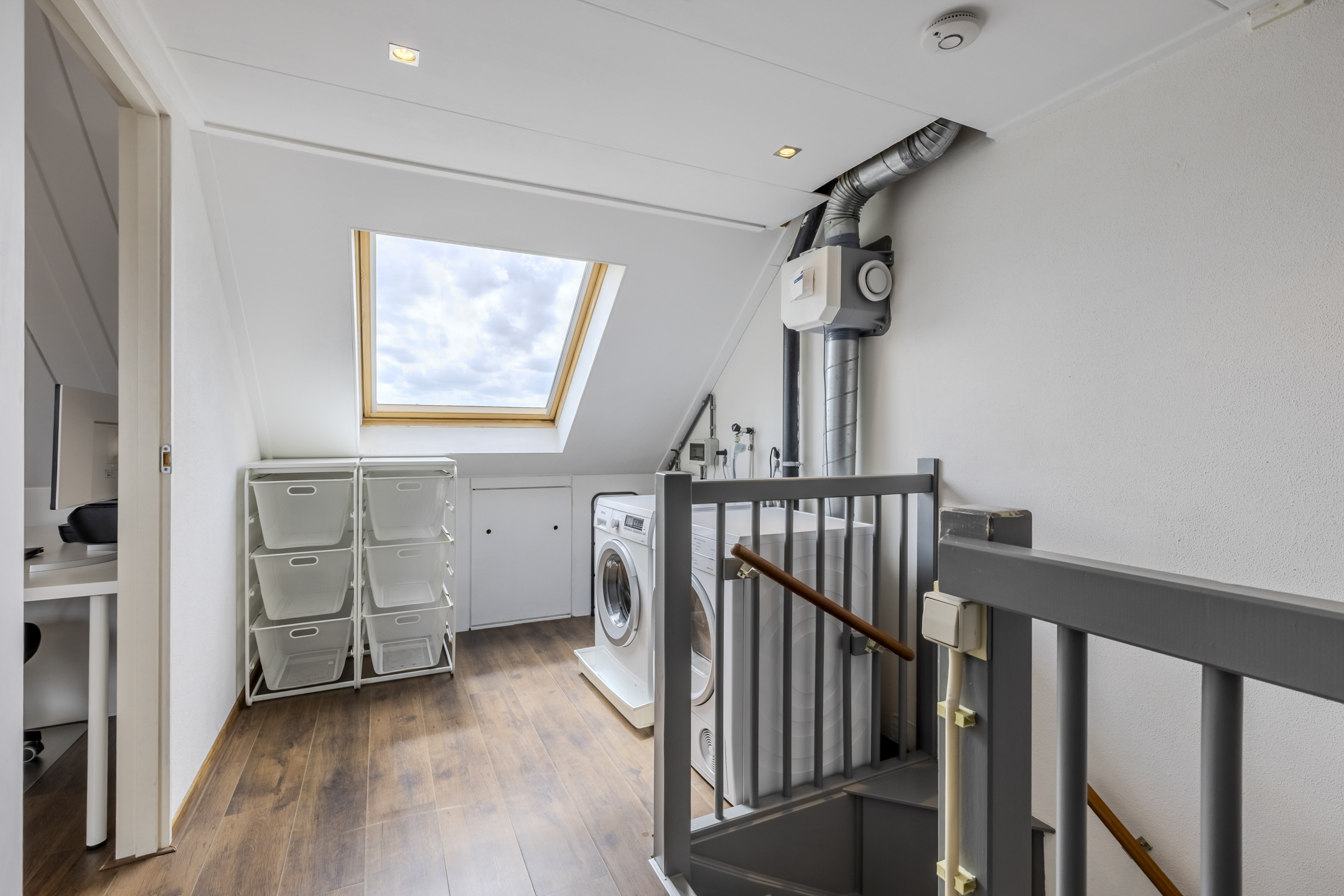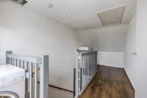 Via een vaste trap te bereiken ruime voorzolder met laminaatvloer, dakraam, unit voor de mechanische ventilatie (2024), aansluitingen voor de wasapparatuur en de omvormer voor de zonnepanelen.