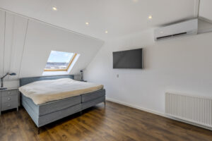 Zeer ruime zolderslaapkamer circa 20m² met airco (2021), laminaatvloer, structuur wandafwerking, dakraam en inbouwspots.