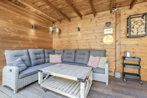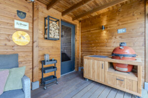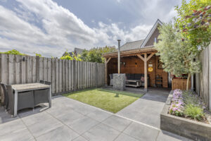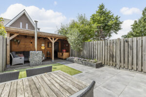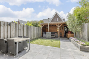 Achterin de tuin is een grote houten overkapping (2019) aanwezig die toegang geeft tot de berging.