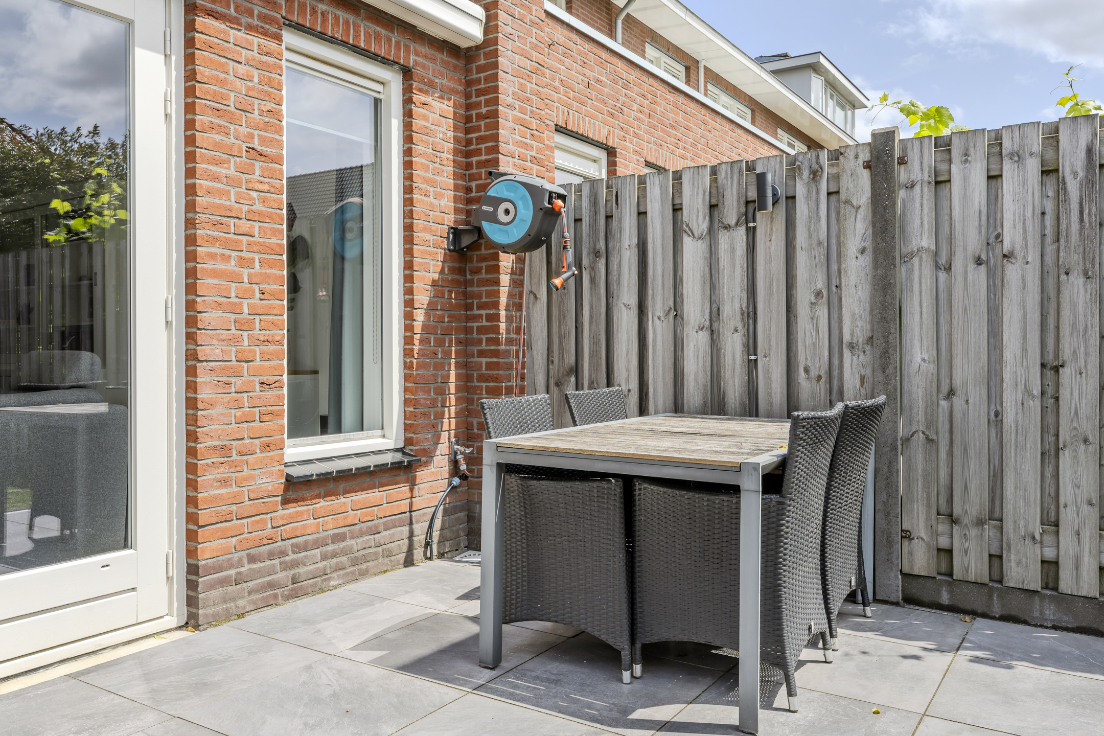 Ruime en fraai aangelegde achtertuin op het zonnige zuiden. De tuin is aangelegd met een groot terras waar u heerlijk in de zon kunt genieten. Aan de achtergevel is over de volledige breedte een elektrisch bedienbaar zonnescherm aanwezig met een uitval van 3 meter.