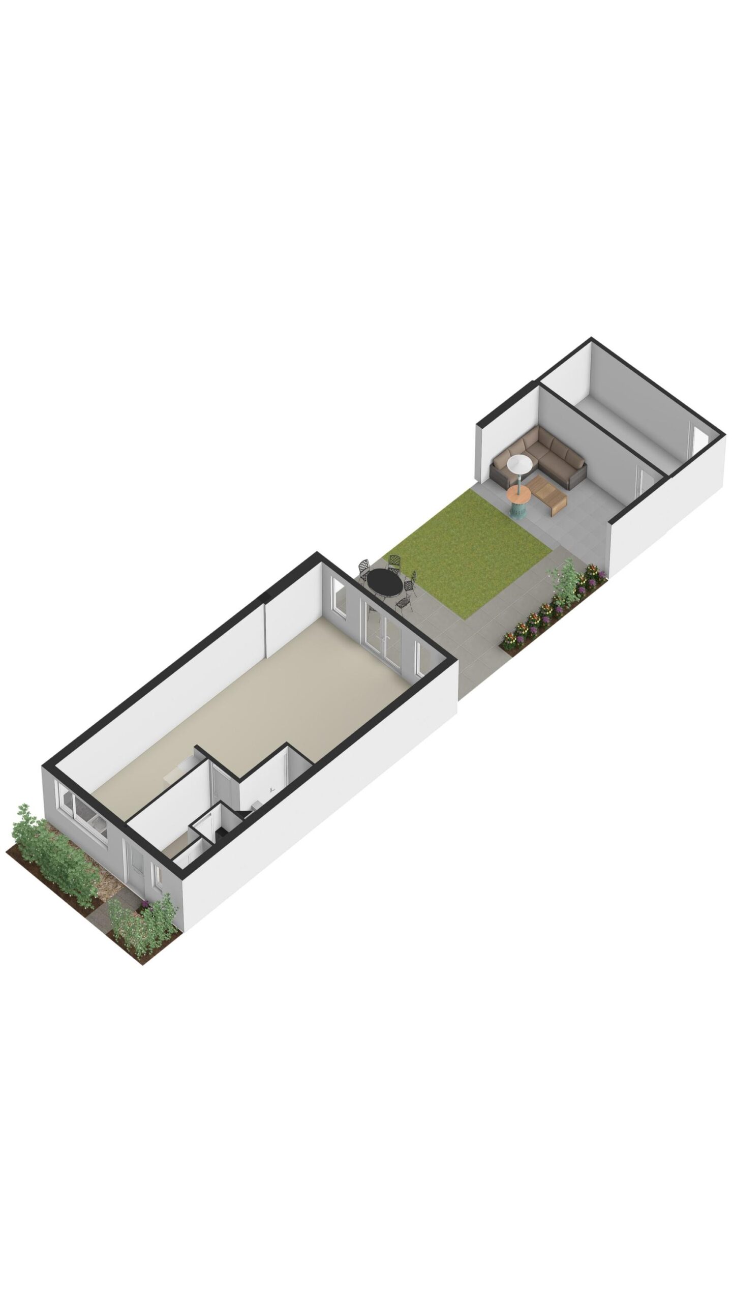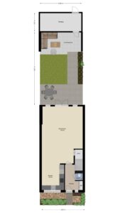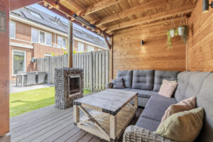 - Achterzijde van de woning is voorzien van een elektrisch zonnescherm over de gehele breedte van de woning.