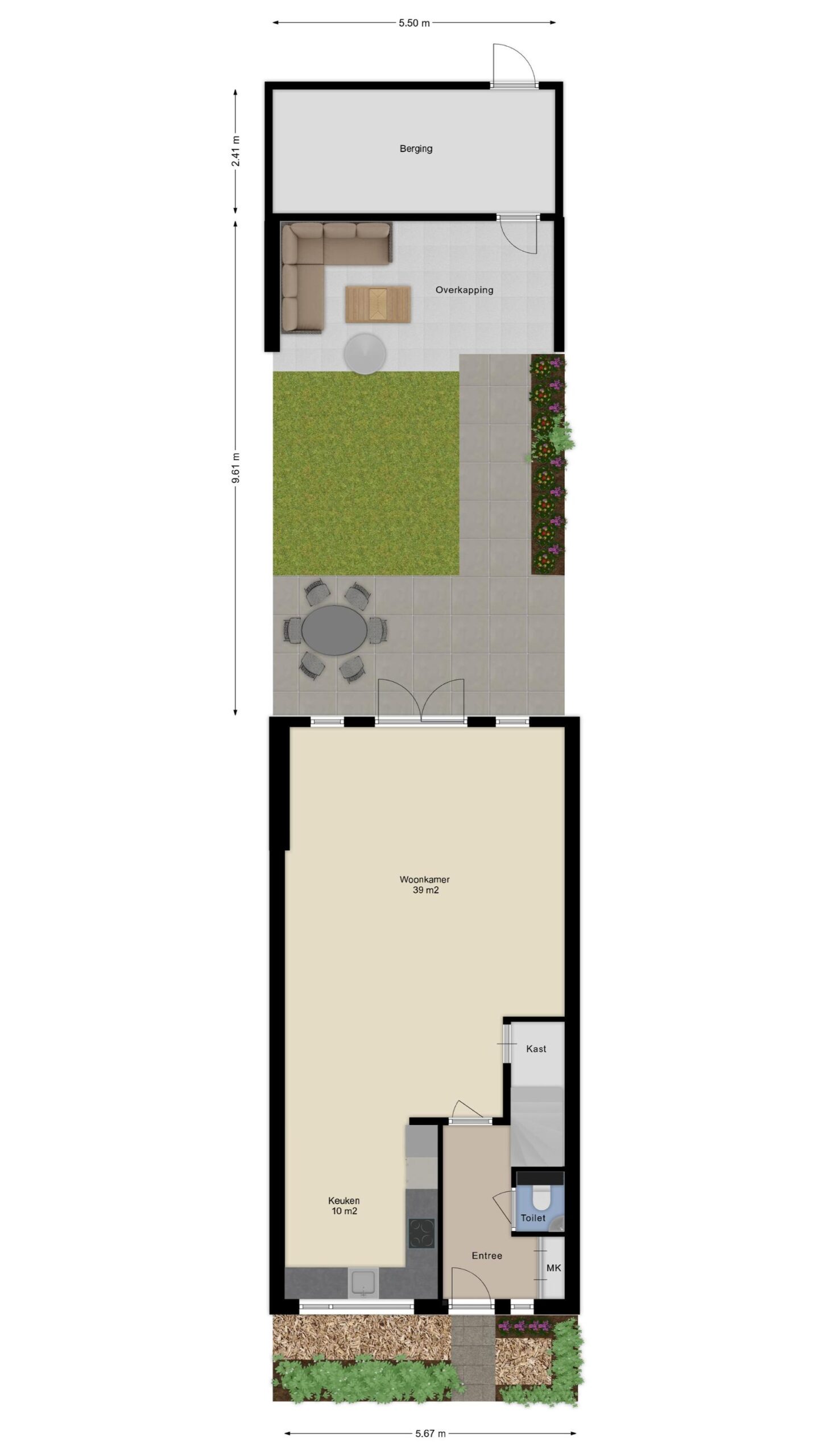 De stenen berging is over de volle breedte van het perceel gebouwd. Er is tevens een eigen achterom aanwezig waardoor er via de berging toegang is tot de tuin.