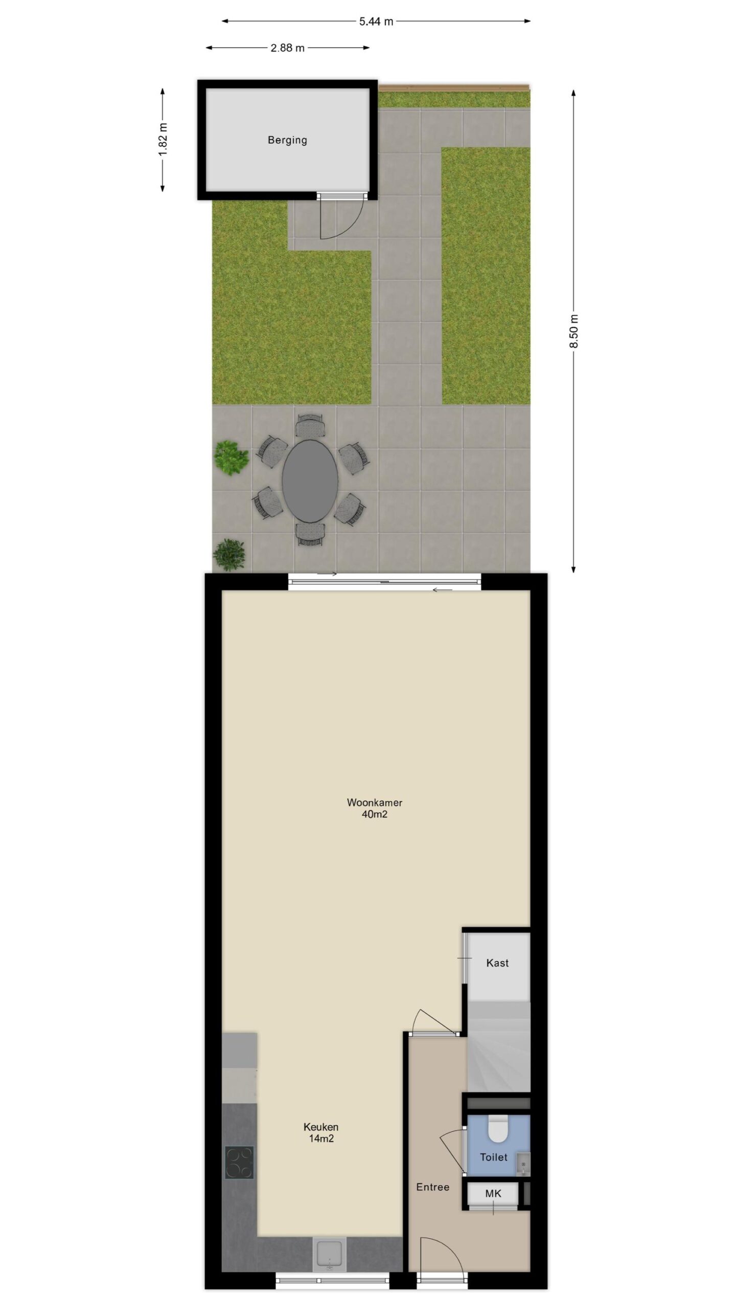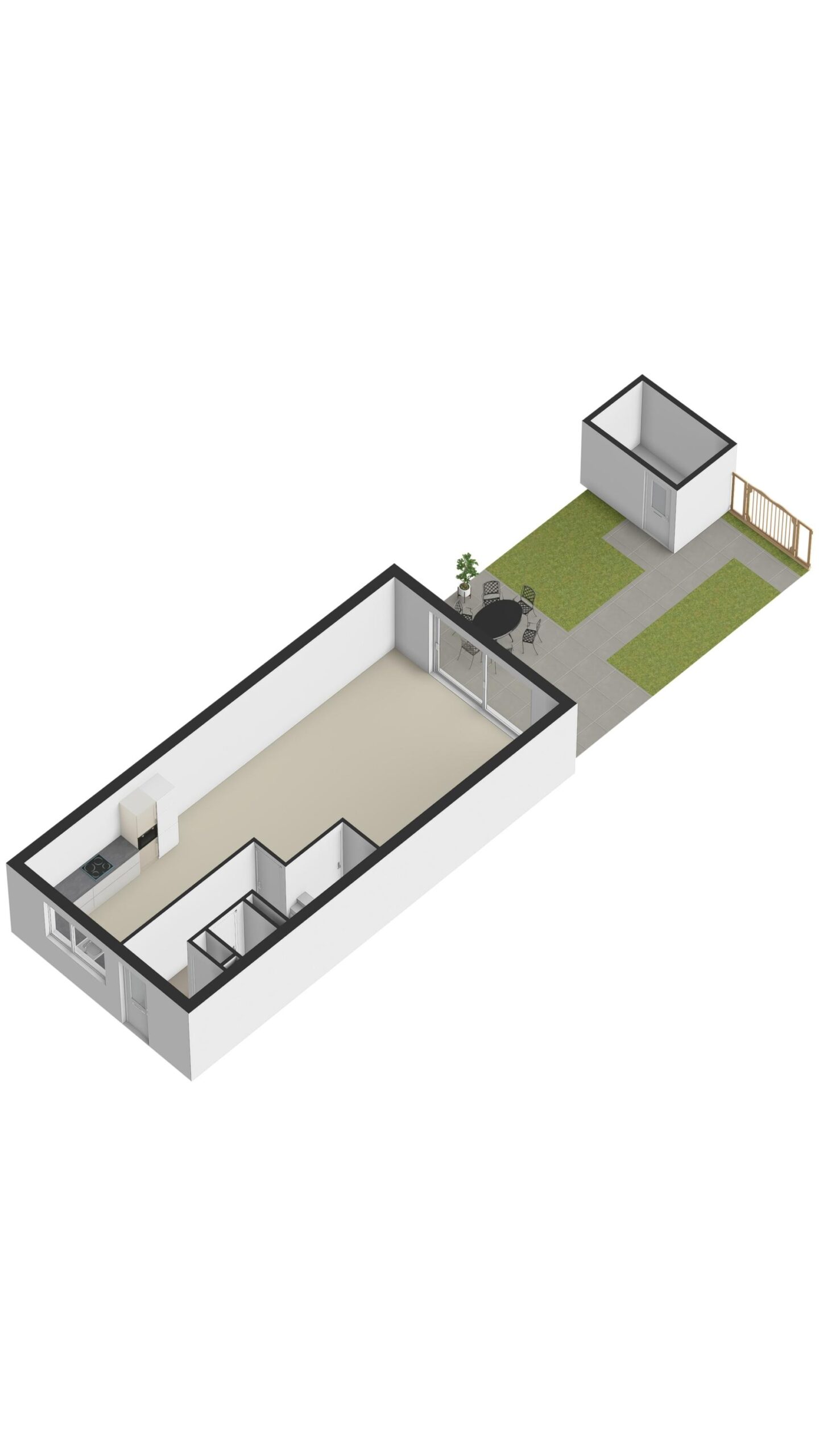 Direct achter de woning bevindt zich een groot terras. In de tuin is daarnaast kunstgras aanwezig, een buitenkraan, houten berging en een achterom.