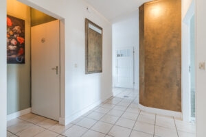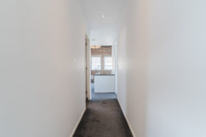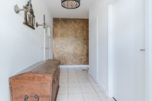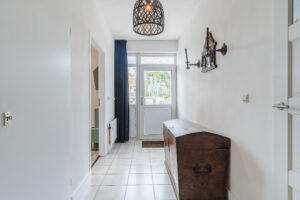 De hal geeft toegang tot de woonkamer, portaal, twee slaapkamers, badkamer en de garage.
