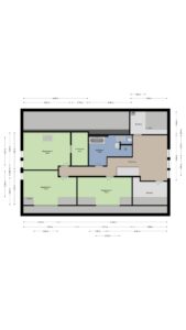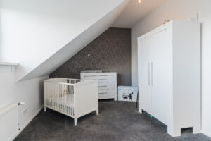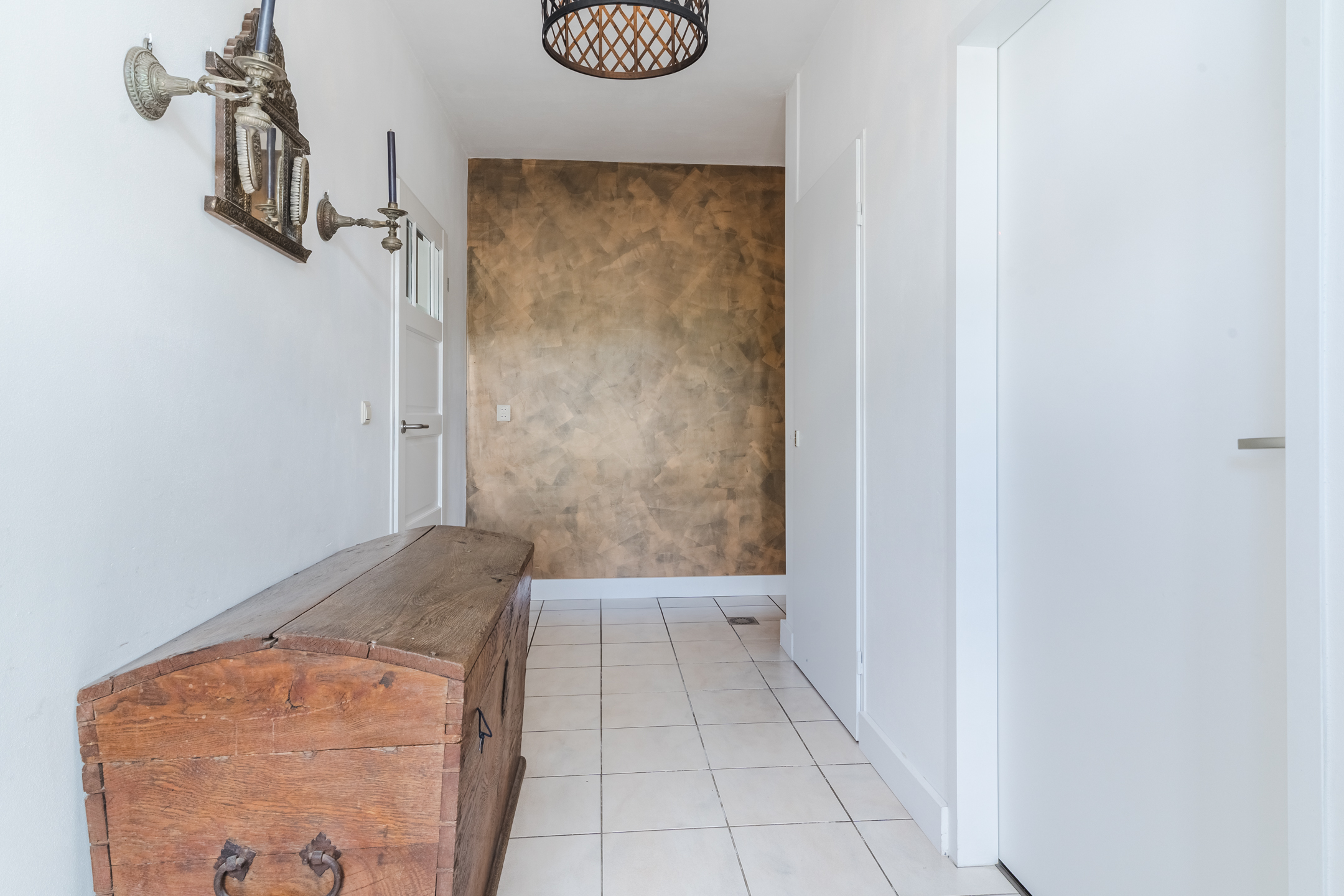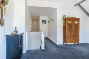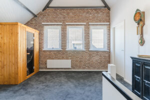De ruime overloop heeft een zicht tot de nok, wat een ruimtelijk effect geeft. De overloop geeft toegang tot drie ruime slaapkamers, de badkamer en twee ruime bergingen.