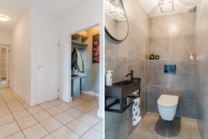 Entree, ruime hal met tegelvloer, uitgebreide meterkast (met krachtstroom), moderne en luxe toiletruimte (2024) voorzien van een vrij hangend toilet met fontein en een praktische trapkast.