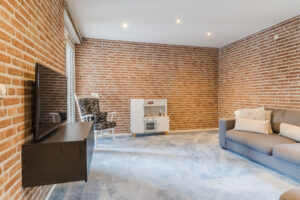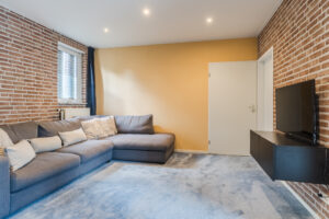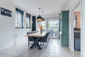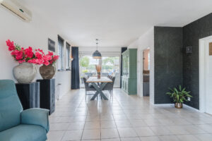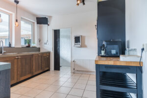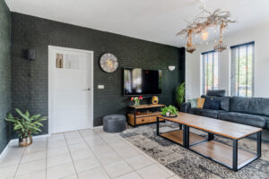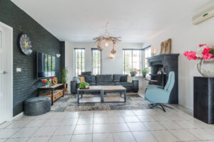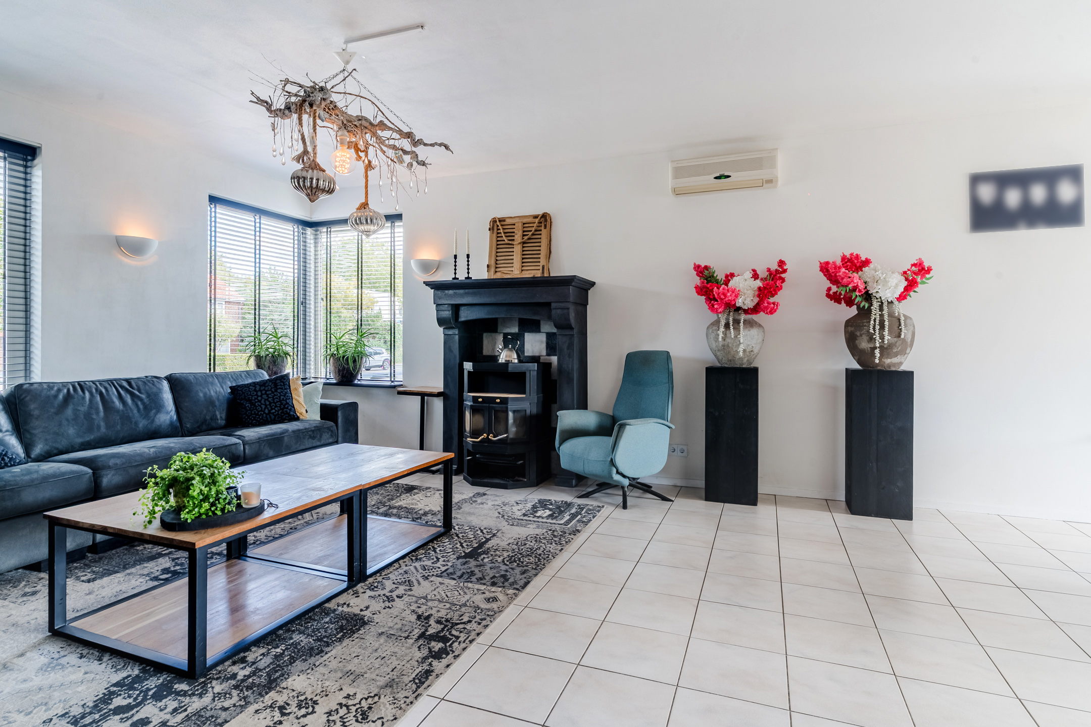 Sfeervolle woonkamer van circa 37m² voorzien van een tegelvloer met vloerverwarming, schouw met houtkachel, airco en een schuifpui naar de achtertuin.