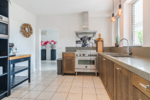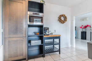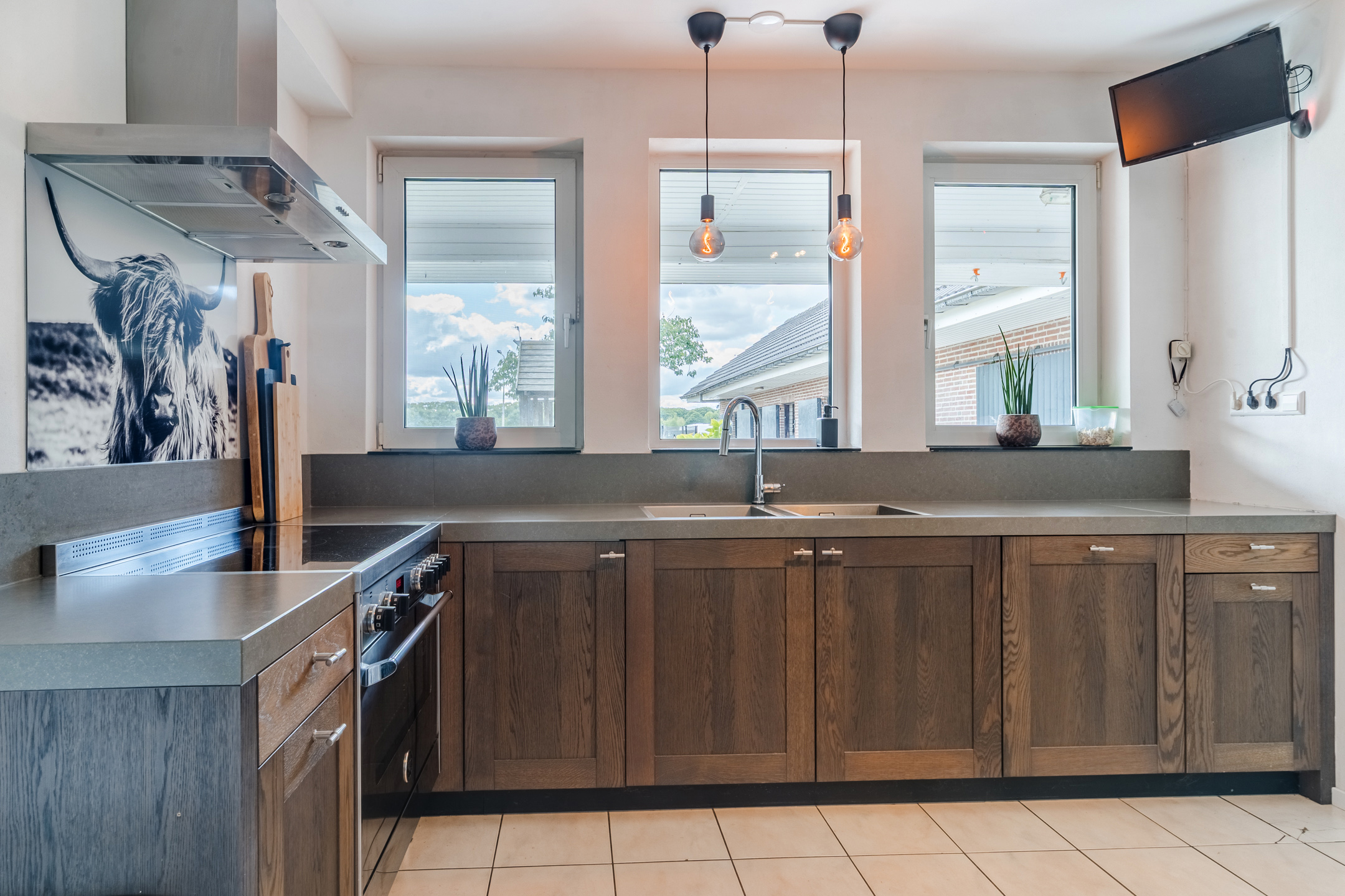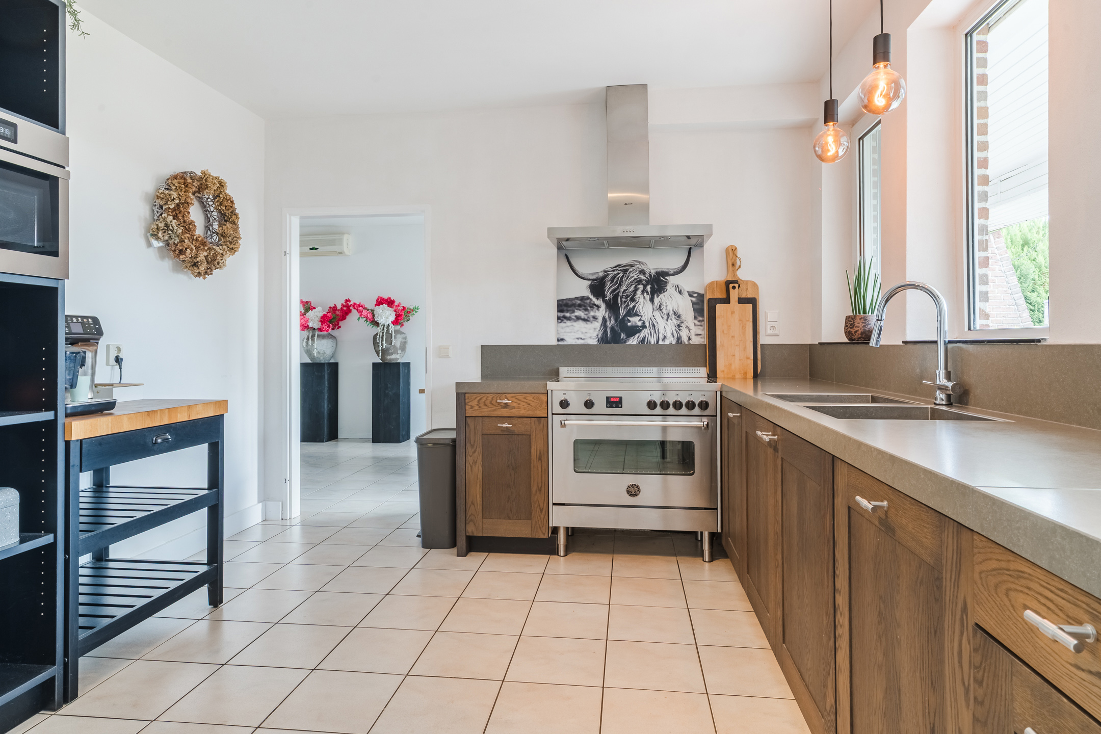De ruime keuken circa 12m² is voorzien van een keukeninrichting (2023) in hoekopstelling met een wandmeubel. De keuken beschikt over een 5-pits keramische kookplaat met oven (Bertazzon), afzuigkap, koel-/ vriescombinatie en een vaatwasser.
