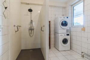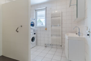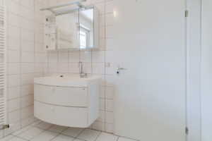 Slaap-/ werkkamer circa 11m² aan de voorzijde van de woning en een ruime slaapkamer circa 19m² aan de achterzijde van de woning met een schuifpui naar de achtertuin. Aansluitend aan deze slaapkamer bevindt zich een licht betegelde badkamer met een brede vaste wastafel met meubel, inloopdouche met regendouche en thermostaat kraan en de aansluitingen voor de wasapparatuur.