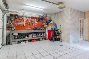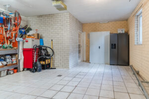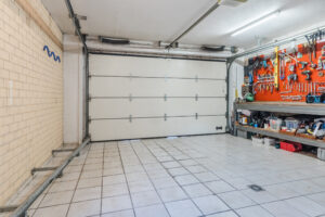 Inpandig bereikbare, grote garage circa 27m² met tegelvloer en een extra brede, elektrisch bedienbare geïsoleerde sectiedeur.