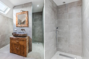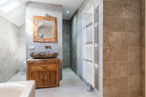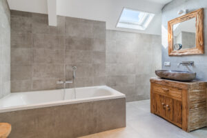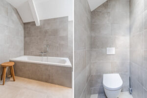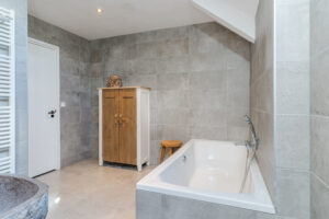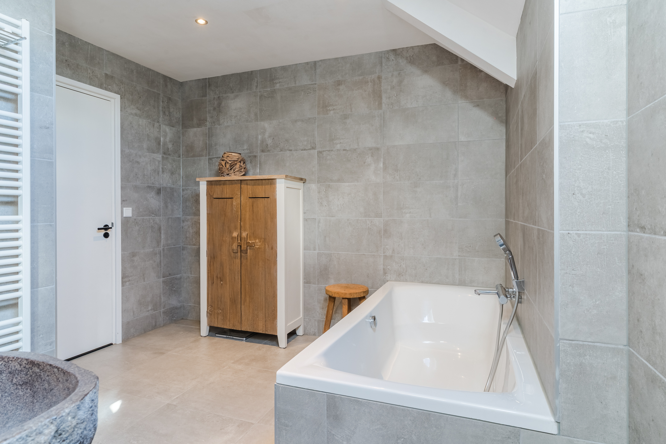 Luxe badkamer (2016) voorzien van een waskom met meubel, groot ligbad met thermostaat kraan, inloopdouche met regendouche, vrij hangend toilet en een design radiator. De badkamer is daarnaast voorzien van strak stucwerk plafondafwerking met inbouwspots en een dakraam.
